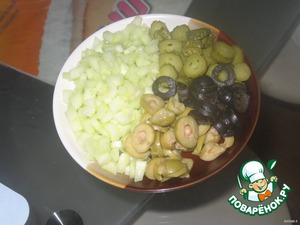 Маслины, оливки, корнишоны порезать колечками (можно взять что-то одно).