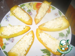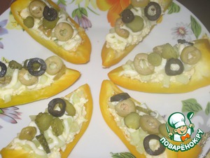 Красную рыбу (у меня семга), тонко порезать (еще лучше взять готовую нарезку), скрутить цветочек, установить его на перец, украсить полосочками огурца.... и
