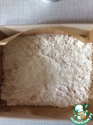 Теперь засыпаем первый слой нашего сухого теста, выравниваем и притрамбовываем рукой, слои теста не толстые примерно 5 мм не больше.