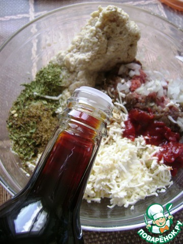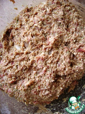 Смешать фарш с рубленным луком, натертым на средней терке сыром и овсяной кашей. У меня крутая каша из быстро варких хлопьев марки «Экстра». Добавить томатную пасту, пряности и соевый соус «Киккоман» классический. Как-то у меня этикетка в фокус не попала –но это он и есть! Можно досолить, но нам и так было вкусно.
