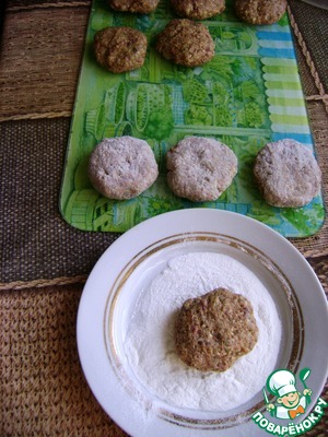 Мокрыми руками сформовать котлеты, запанировать их в рисовой муке. Можно и в пшеничной, и в сухарях, но я лично очень люблю рисовую панировку –она ровно ложится тонким слоем, хорошо схватывает продукт и совсем не горит при жарке.