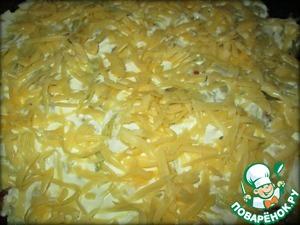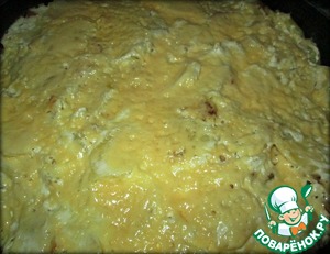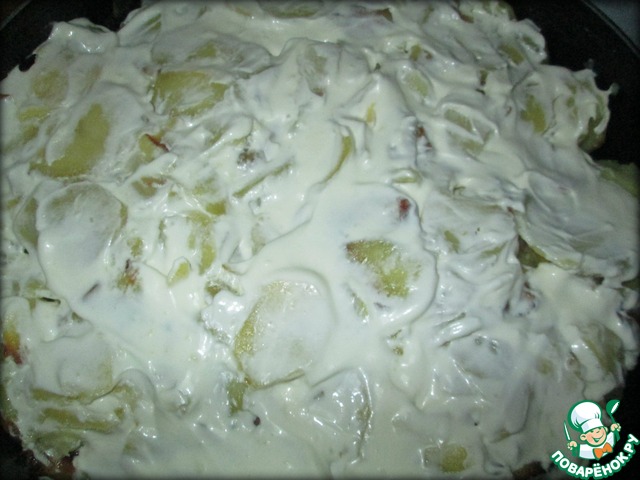 5. Огонь убавить до минимума. На картофель равномерно нанести соус.