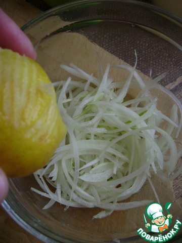 Лук нашинковать вдоль луковицы очень тонко. Полить лимонным соком, добавить сироп шиповника и оставить мариноваться минут на 15.