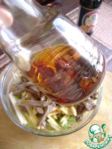 Полить салат растительным масло и по способностям добавить перечное масло. Если у вас его нет, добавьте щепотку острого молотого красного перца, а на досуге приготовьте перечное масло – очень удобно добавлять его в салаты и много еще куда.