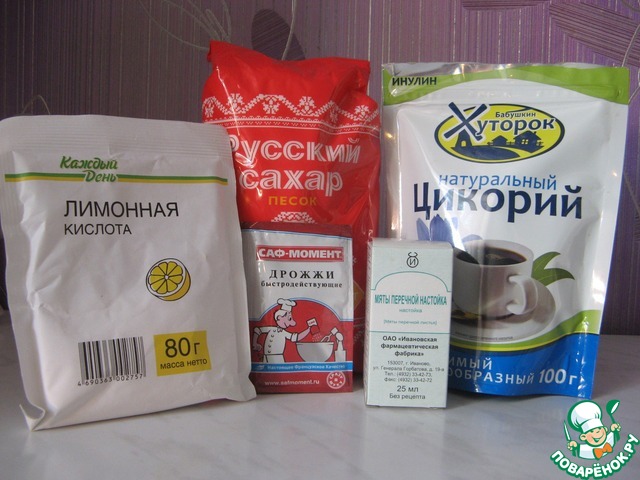 Вскипятить воду, добавить сахар, цикорий, лимонную кислоту и настойку мяты. Когда остынет добавить дрожжи и поставить в теплое место на 12 часов для брожения.