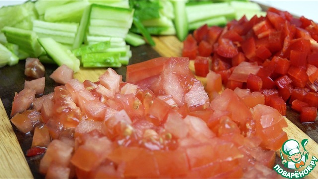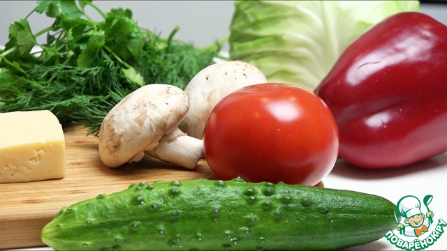 Далее - огурец, перец, помидор и сыр.