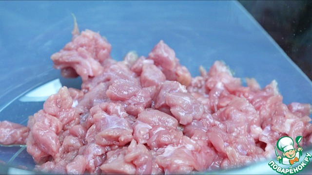 Второй секрет - это мясо. В это блюдо я кладу только свинину (можно с жирком). Мясо нужно подсолить и хорошо прожарить с луком. Его я режу мелко, а лук полукольцами. Кусочки мяса должны быть поджаренными, даже слегка хрустящими.