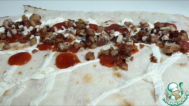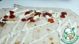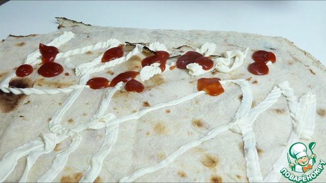 Раскладываем лаваш на столе. Обильно смазываем майонезом и поливаем кетчупом.