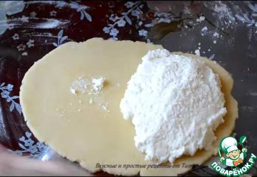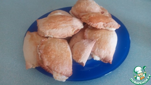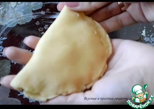 Разделяем на 6 частей. Каждую часть раскатать овалом, на одну сторону кладем начинку и накрываем второй частью. Немного скрепляем. Как на фото.