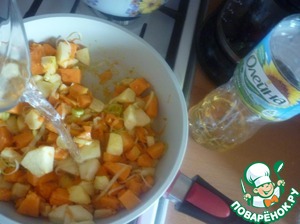 Овощи обжарить на среднем огне на растительном масле (минуты 3-4). Добавить воду (400-500 мл, для непостного варианта можно влить мясной бульон), довести до кипения, убавить огонь и варить овощи под крышкой 20 минут.