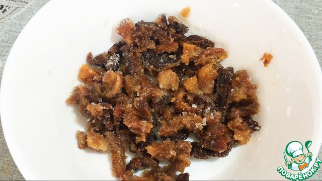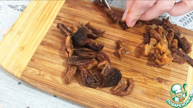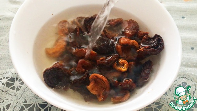 Для начала заливаем сухофрукты кипятком, чтобы они стали мягкими и немного разбухли. Я взяла домашнюю сушку - сливы и абрикосы.
