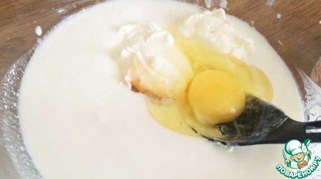Выливаем в миску кефир. Добавляем яйцо и творожный крем (или творожную массу любую). У меня был крем с абрикосовым джемом. Но можно такие оладушки делать и без творожной массы. Просто на кефире.