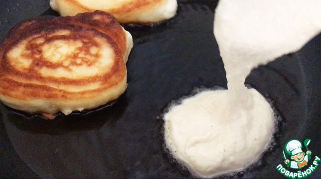 Теперь формируем сами оладушки. Ложку теста выкладываем на сковороду.
