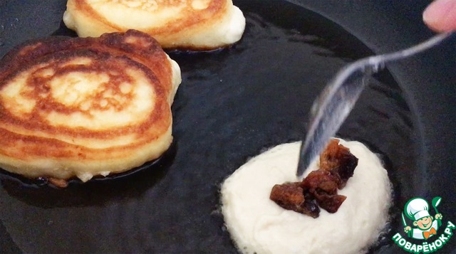 Начинку - в середину оладушка. Сухофрукты немножко нужно "утопить" в тесто ложечкой.