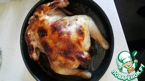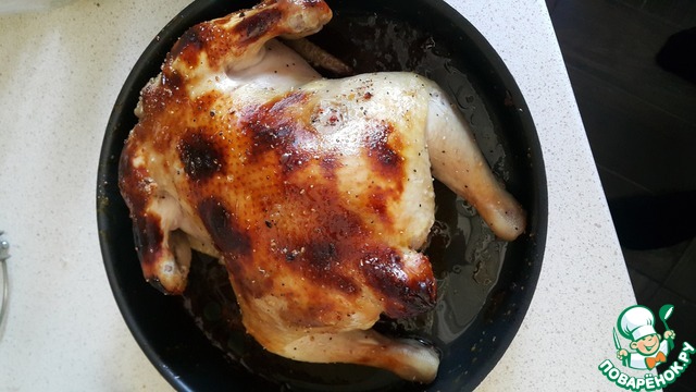 Теперь необходимо положить наши грибочки во внутрь курицы и смазать медом. У меня мед домашний был, я взяла 2 ложки столовых меда, растопила их и кисточкой смазала курицу. На 40 минут в духовку. 20 минут на 200 градусов и 20 минут на 170 градусов. Получилось просто великолепно!