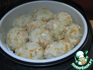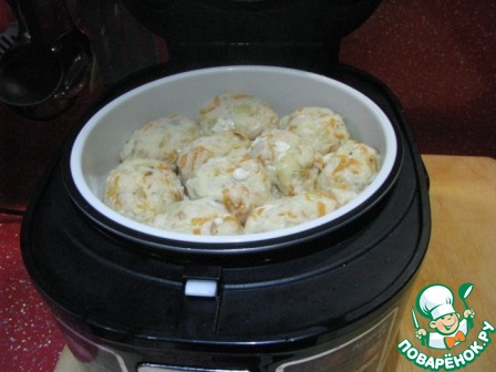 По окончании программы овощи вынуть и добавить в фарш. Также разбить в фарш яйцо, посолить, добавить специи. Тщательно перемешать и слепить котлетки, выложить в емкость для пара. Налить в чашу 1 л. воды. Выставить программу "Пар" на 30 минут.