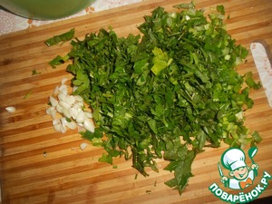 Всю зелень мелко порезать. Чеснок тоже мелко нарезать.