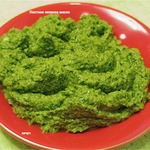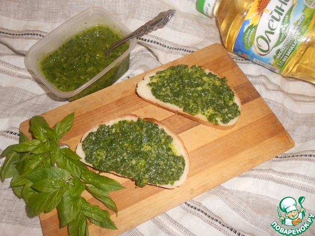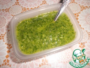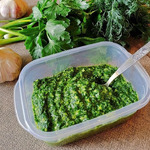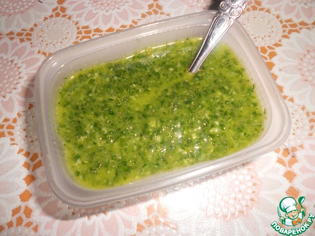 В чашу блендера выложить половину зелени и половину растительного масла. Взбить. Затем прибавить потихоньку то зелени, то масла. Взбить до однородной массы.