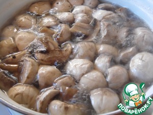 Шампиньоны очистить, нарезать половинками (если грибы крупные - четвертинками), хорошо промыть. Залить холодной водой, довести до кипения, снять пену, посолить, поперчить, варить на небольшом огне 10 минут.