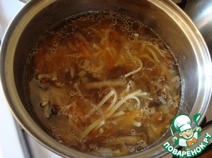 Грибы помыть, они быстро разморозятся. В кастрюлю налить 1,5 л воды и отварить в ней грибы. Варим минут 15, солим.