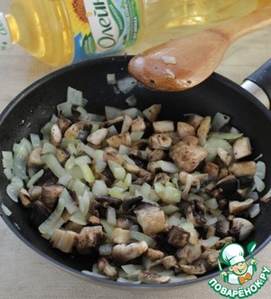 В сковороде разогреть растительное масло "Олейна", обжарить лук и грибы.