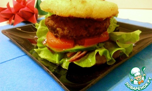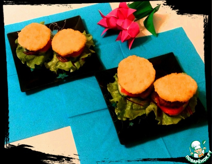 Ну и пришло время все собрать в "рисо-бургер". Рисовые лепешки для низа и верха намазать кетчупом.