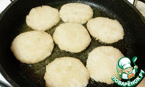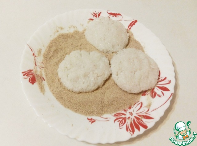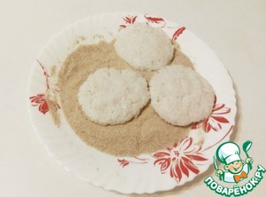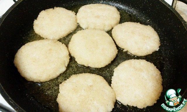 Мокрыми руками из теплого риса формируем лепешки и панируем. Из данного количества риса получилось 20 лепешек.