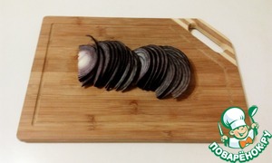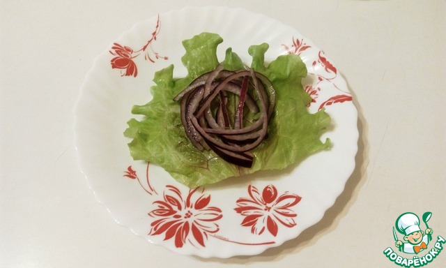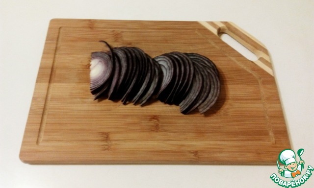 Лук нарезать полукольцами и замариновать. Для этого все ингредиенты растворить в воде. Маринадом залить лук и поставить на 30 минут в холодильник. Затем на дуршлаг и промыть холодной водой.