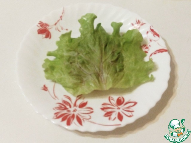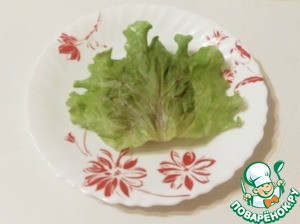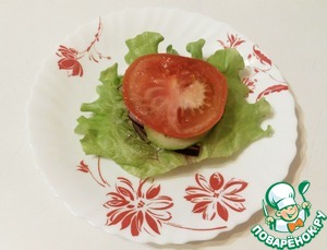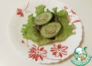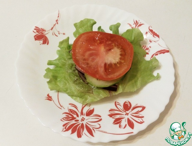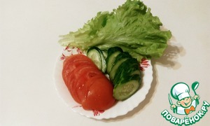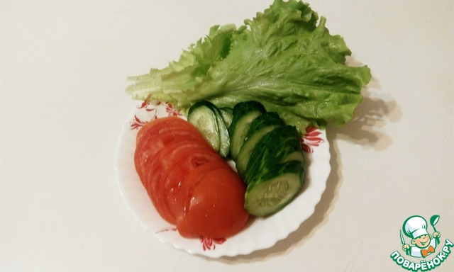 Теперь подготовим овощи. Листья салата обмыть и обсушить. Помидор и огурец обмыть, обсушить и нарезать кольцами.