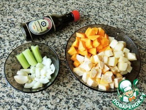 Корнеплоды, тыкву и черешок сельдерея порезать небольшими кусочками. Измельчить лук и чеснок.