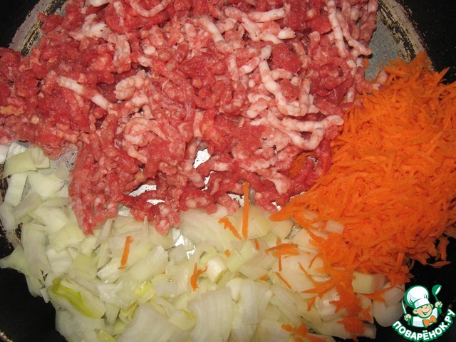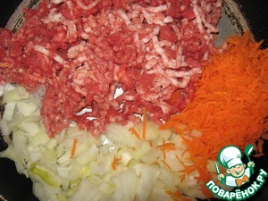 Слегка обжарить на растительном масле фарш, лук, нарезанный кубиком и морковь, натертую на мелкой терке. Добавить соль, специи.