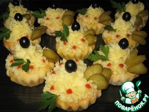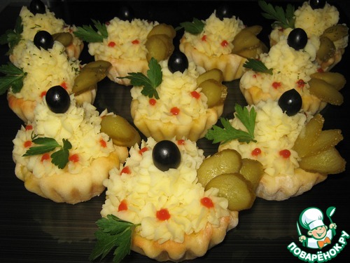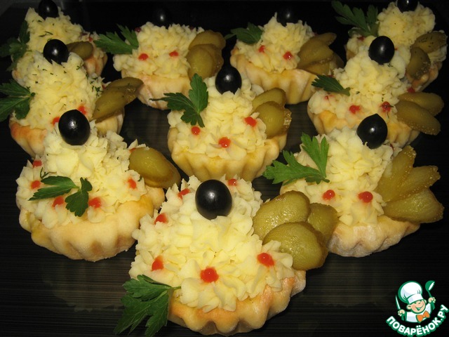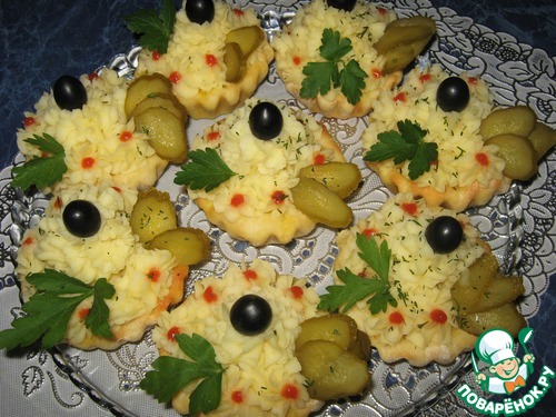 Украсить по своему вкусу и фантазии. Я нарезала маринованный огурчик, и украсила маслинами, зеленью и кетчупом.