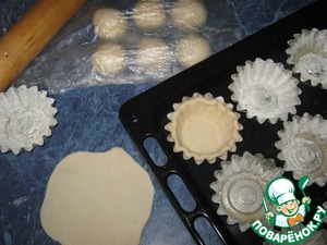 Тесто я поделила на 10 кусочков. Подкатала в шарики. Формочки смазала растительным маслом, присыпала мукой. Раскатала каждый шарик и выложила в формочки.