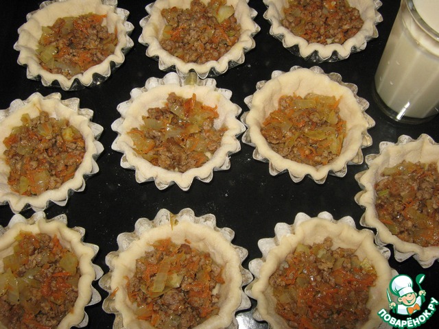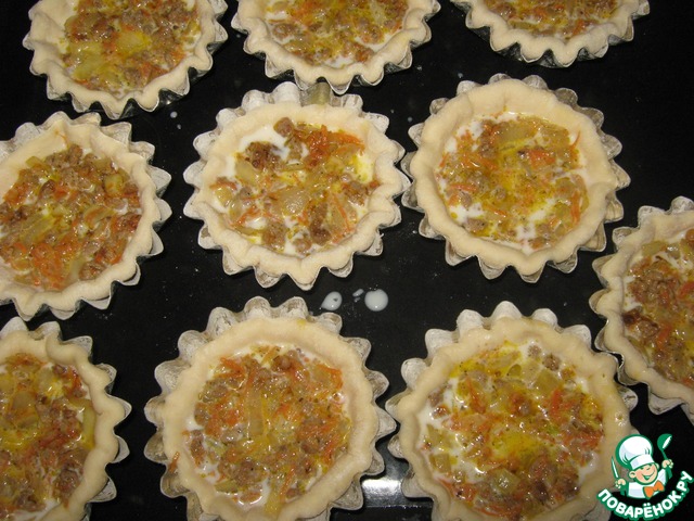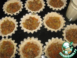 Добавила мясную начинку. Подготовила заливку - взбила яйцо в молоке.