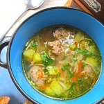 И варил картошку 10 минут,закинул фрикадельки - варил еще 8 минут,затем закинул все остальное и варил еще 5 минут.