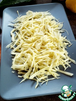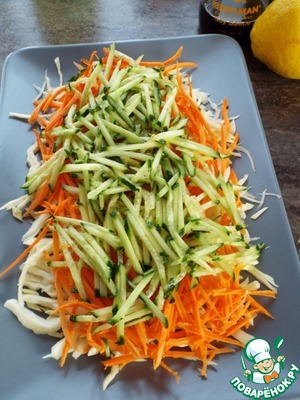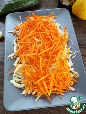Морковь натереть на терке для корейских салатов или нарезать тонкими полосками. Выложить поверх капусты.
