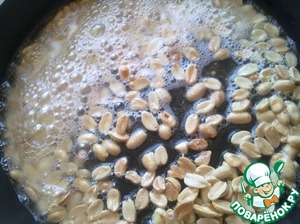 Когда курица и перец обжарились, добавить обжаренный арахис и влить в блюдо приготовленный соус. При нагревании соус загустеет. Блюдо хорошо помешивать. Дать соусу покипеть 5-7 минут.