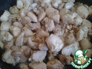 Теперь в этом же масле обжарить кусочки курицы. Мясо сразу выпустит жидкость, которая быстро испарится. Курица должна жариться, а не тушиться.