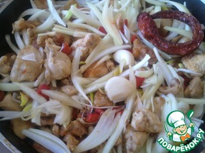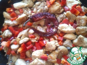 Как только курица стала румяниться, добавить острый перец и нарезанный сладкий. Продолжать обжаривать, помешивая.