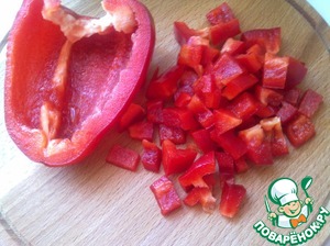 Болгарский перец (красный или зеленый), очистить от семян, плодоножки и нарезать квадратиками. Перец чили, ( если вы не любители острой еды) можно оставить целым.