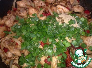 Добавляем молотый имбирь, карри, перец красный жгучий и зеленый лук. Обжариваем на среднем огне 15 минут.
