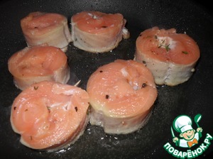 Филе лосося нарезать на полоски, посолить, поперчить. Завернуть в рулетики, закрепить шпажкой.