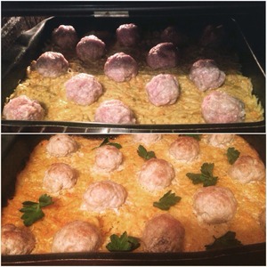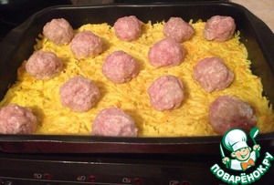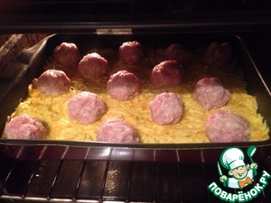 Выкладываем ровно в противень, далее лепим из фарша тефтели. Чтобы они хорошо лепились, лепите мокрыми руками. Выкладываем на нашу "сырую запеканку".