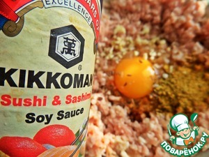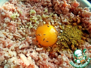 В свиной фарш добавить яйцо, тмин, рубленый чеснок, микс приправ. В мои входят: горчица, лук, куркума, морковь, базилик.