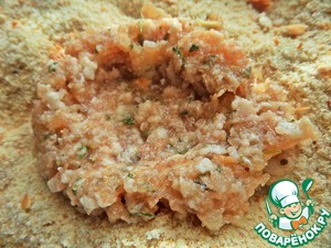 Берём ложку фарша, переносим в домашние панировочные сухари, делаем в центре ямку.
