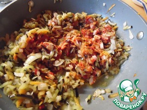 К овощам добавить томатную пасту, посолить, поперчить, приправить травами, тушить 3-4 минуты.