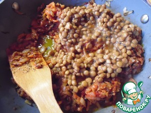 Из чечевицы слить жидкость, чечевицу добавить к овощам, хорошо прогреть.