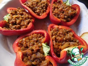 Полученной начинкой нафаршировать половинки перцев, вернуть в духовку на 15 минут.