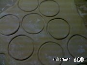 Тесто раскатывается тонким пластом, стаканом с тонкими краями или от руки вырезаются кружочки, на середину кладется мясная начинка - полная кофейная или неполная чайная ложка. Края слепить..