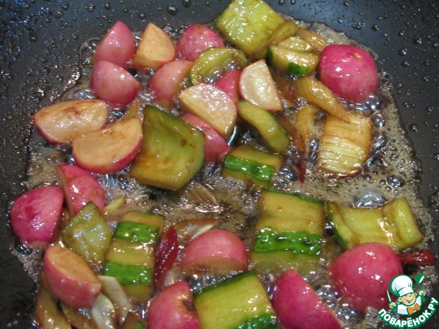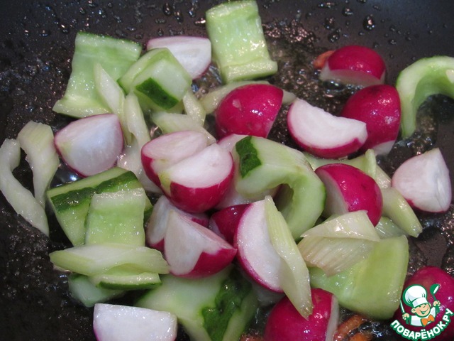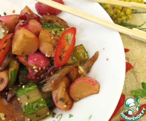 Теплый, пряный, остренький... Мягкий вкус огурца и резковатый аромат редиса, сдобренный сладостью и остротой перца чили. Привычный весенний набор овощей в непривычном прочтении. Всем любителям восточной кухни посвящается!